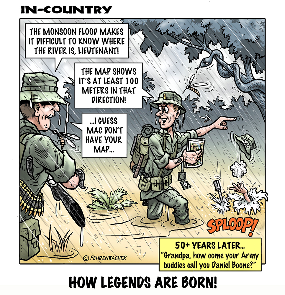 Phil enlisted in the Army in 1965 where you served for years in Vietnam. He became a graphic designer and has worked for the state of Oregon for 26 years. He retired in 2003 and started the Cartoon "In-Country". The cartoons reflect his experiences during his tour of duty in South Vietnam.